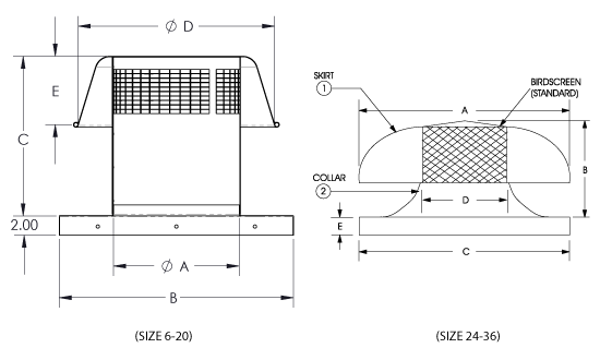 RCXII and RCXII-SF relief or intake ventilators feature low contour spun aluminum hoods for an attractive appearance. They are designed to exhaust or supply air from or to an enclosed area without the need for a power operated fan. Available in two styles, these fans range in sizes from 6 to 36". The RCXII has a curb cap found on most roof ventilators and must be mounted on a roof curb. RCXII-SF has an extra wide, flat base that installs under roof shingles and does not require a roof curb. Both styles come standard with a galvanized birdscreen.